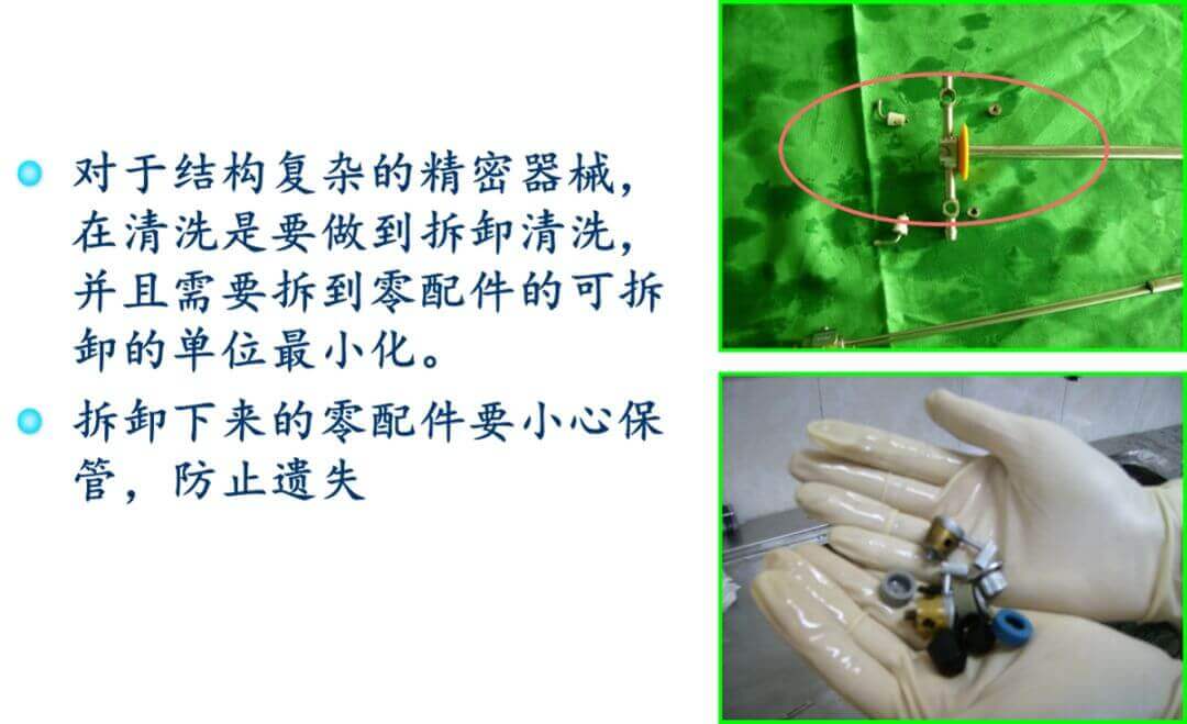 清洗前穿戴好護目鏡、雙層手套、防護服,器械打開關(guān)節(jié),可手工拆的要進行拆卸。
